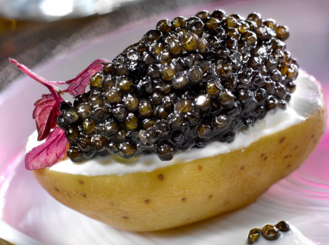 Couper les pommes de terre en deux, les creuser légèrement et recouvrir chaque moitié de crème et de caviar.