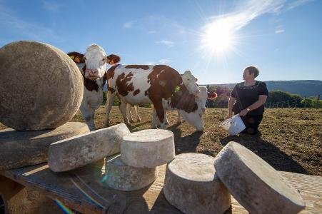 Le troupeau se compose de 100 vaches laitières de race Montbéliarde. Elles pâturent jour et nuit pendant sept mois de l’année. La traite est réalisée matin et soir. Leur alimentation est produite à 95 % sur la ferme est garantie sans OGM. L’élevage respecte le cahier des charges du lait de foin AOP Comté.