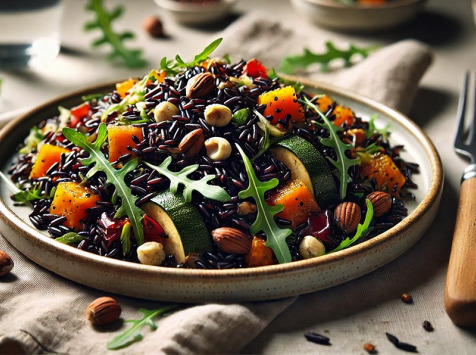 Salade tiède de riz sauvage, légumes rôtis & noisettes grillées